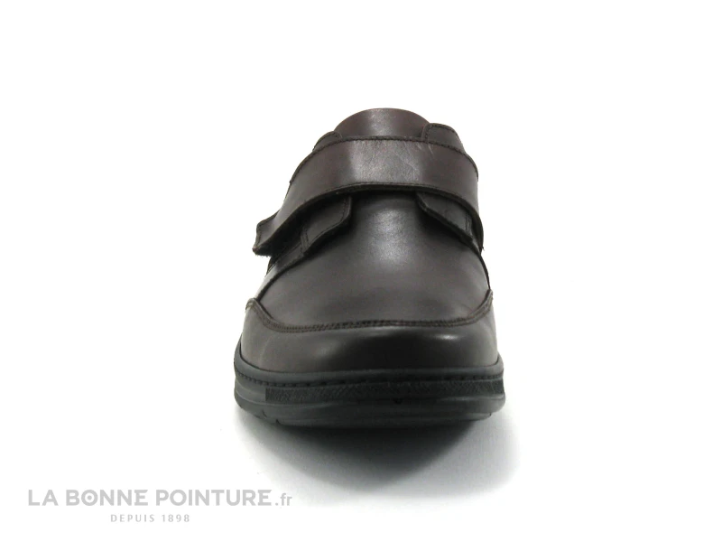 Cette chaussure de ville Homme avec velcro est fabriquée avec un beau cuir marron chocolat, à l’aspect lisse.