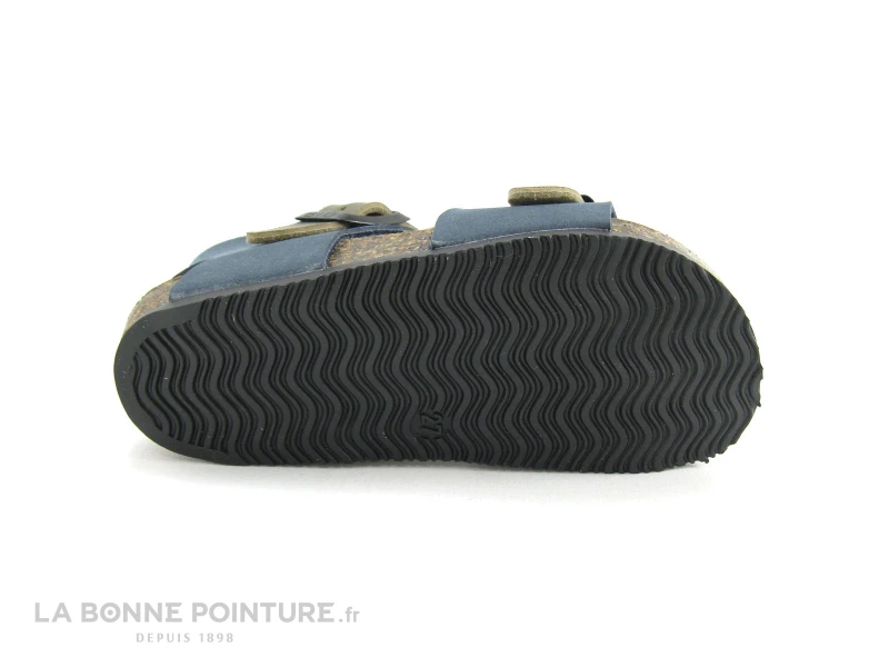 Ces nu-pieds bébé garçon Biomodex 1805 sont en simili cuir marron / kaki et bleu marine.