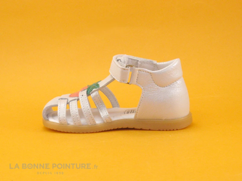Cette sandale bébé à bout fermé Bopy Ragola est en cuir gris clair métallisé, avec une fraise rose et verte sur le milieu.
