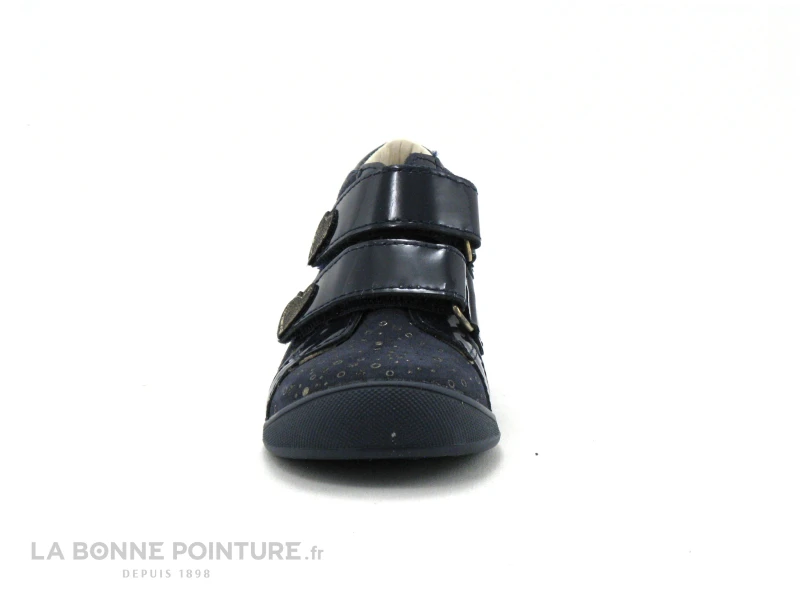 Ce bottillon fillette Bopy Ugoline est en cuir velouté bleu marine, parsemé de petites bulles dorées.