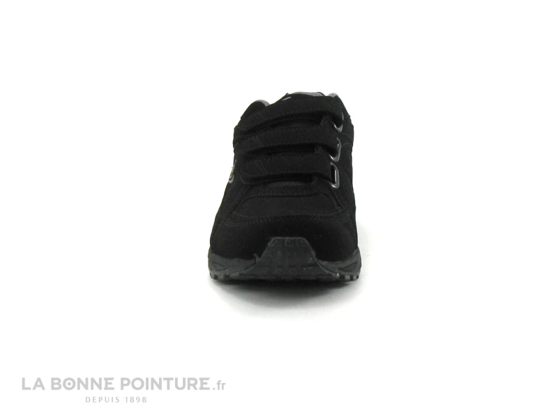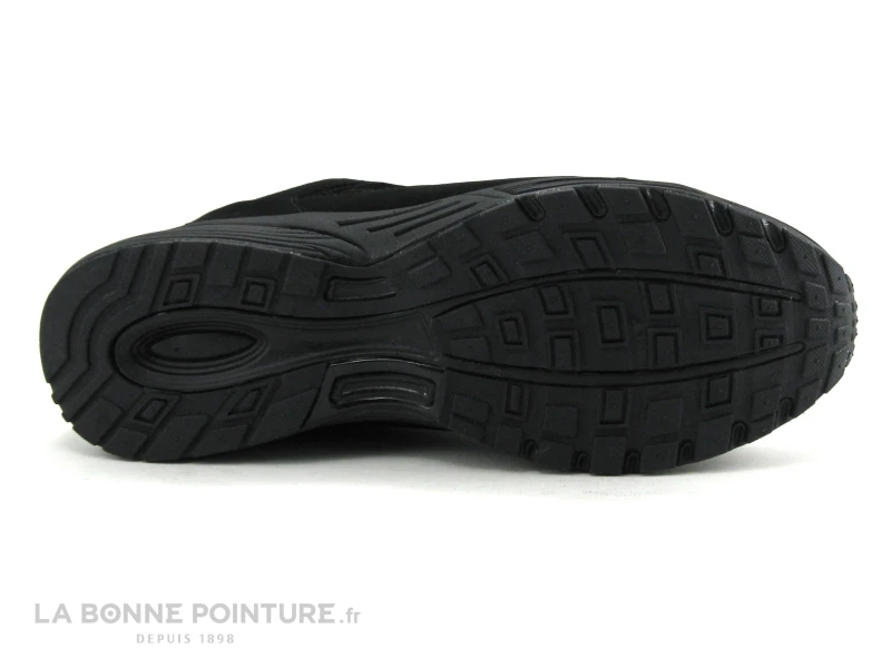Cette chaussure Homme petit prix est noire aspect peau de pêche, avec le tour de cheville et la languette en textile matelassé.