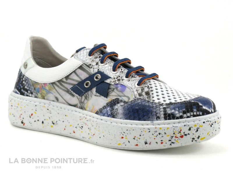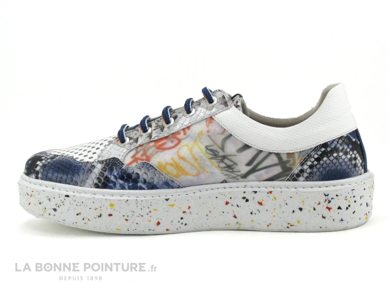 Cette basket basse femme Dorking by Fluchos Trozos combine des parties perforées blanches, imprimées multicolores et aspect python.