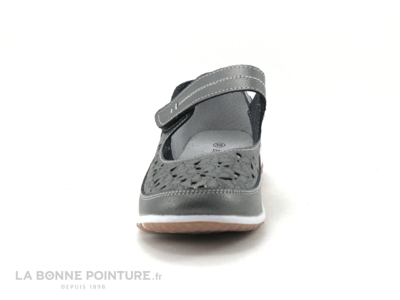 Cette chaussure aérée Femme Enza Nucci est en cuir gris foncé métallisé, ornée de fleurs et de fines perforations sur le devant.