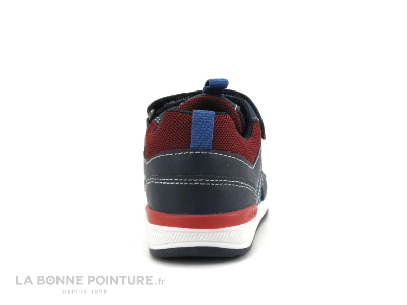 Cette chaussure bébé souple Geox Rishon associe textile et matières résistantes bleu marine, avec des parties rouges et bleu jeans.