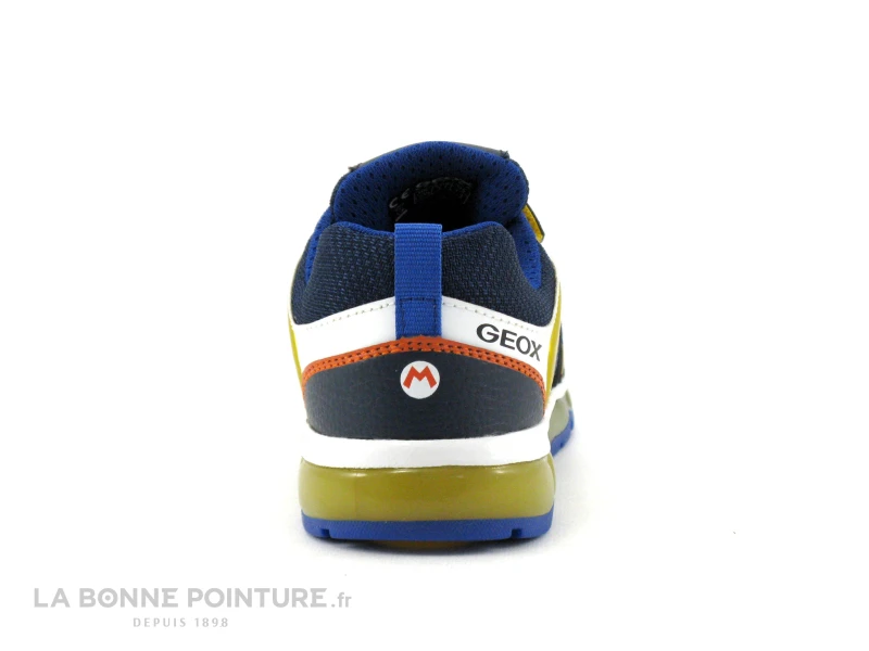 Cette chaussure enfant Geox à leds allie une grande résistance et des coloris attrayants : un savant mélange de bleu marine, bleu électrique et jaune métallisé. Super-Mario apparait sur le côté extérieur de la basket.
