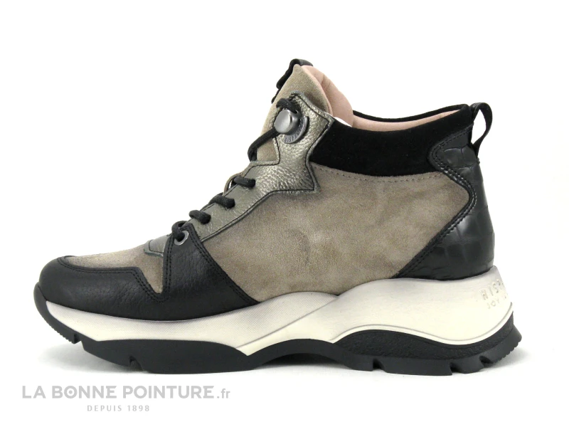 Cette basket montante Femme à semelle compensée est en cuir, combinant des parties noires et taupe velouté, noir grainé, et bronze métal.