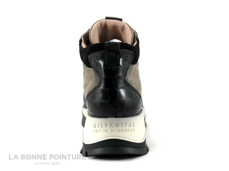 L’arrière des sneakers Hispanitas Bolero se démarque avec son aspect croco, agrémenté d’une petite languette noire sur le haut.