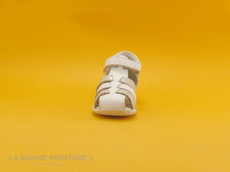 Cette sandale montante bébé fille combine un cuir blanc et un cuir beige nacré.