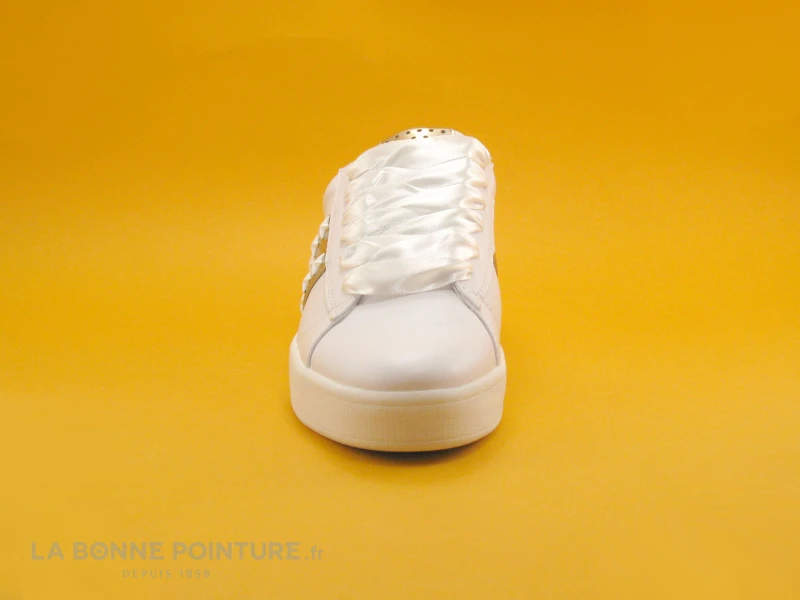 Cette tennis Femme est blanc mat, avec des touches de rose nude brillant et 7 étoiles sur le côté externe de la chaussure.