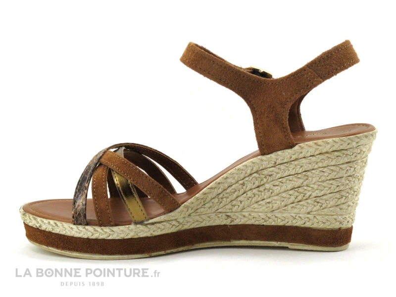 La semelle de marche compensĂ©e effet cordes tressĂ©es donne un petit air d’espadrille au modèle, avec la base marron pour une finition rĂ©ussie.