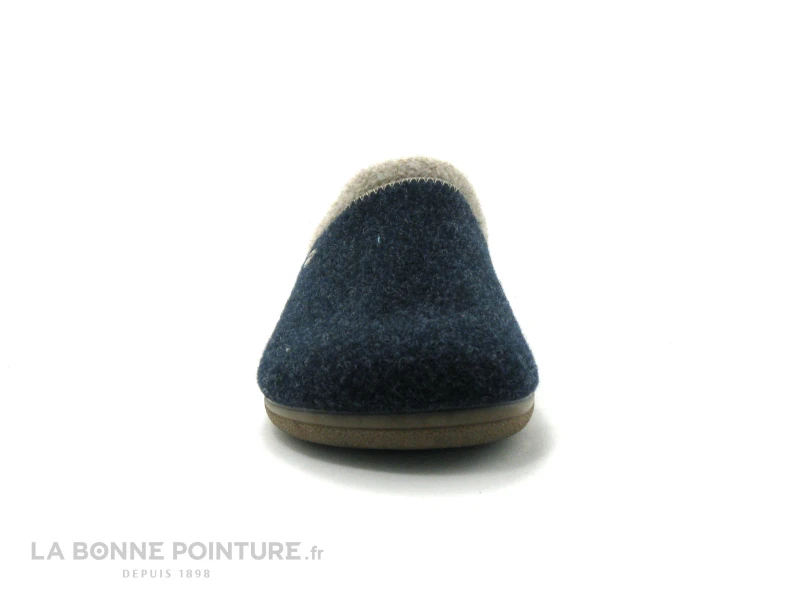 Cette pantoufle sabot Homme façon feutre laineux est bleu foncé, avec le pourtour beige.