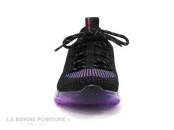 Le lacet élastique violet et argent permet d’enfiler facilement les baskets lumière Skechers, qui se ferment avec la bride à scratch argent.