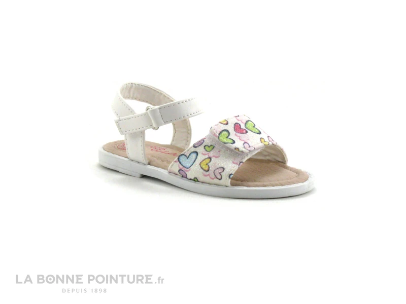 Ce nu-pieds enfant est blanc, avec la bride avant pailletée imprimée petits coeurs multicolores.